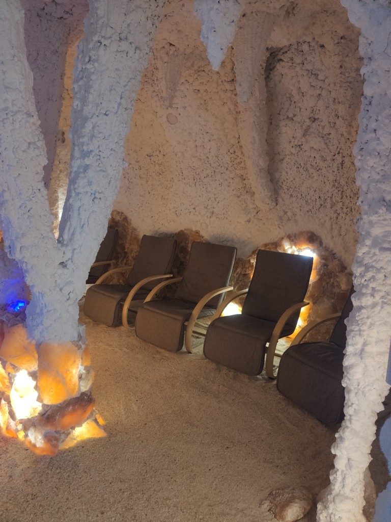 Соляная пещера представляют собой специально созданную комнату, облицованну натуральной солью. Воздух внутри этого помещения насыщен минералами и отрицательными ионами, которые положительно влияют на дыхательную систему и кожу человека. Посетители проводят время в таких пещерах, дышат чистым и очищенным воздухом, а также получают уникальные целебные свойства минералов.